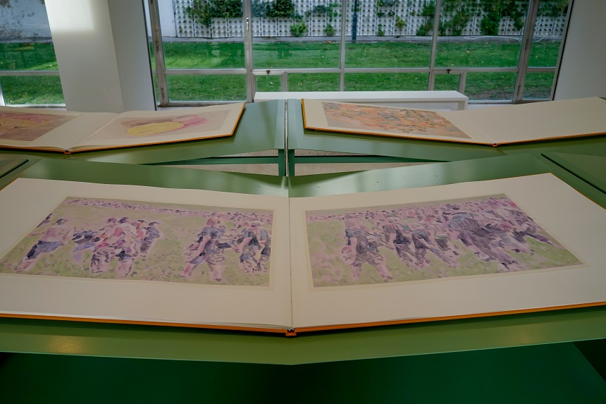 A exposição que Bruno Pacheco (Lisboa, 1974) agora apresenta na Galeria Quadrum é composta por cerca de quatrocentas pinturas sobre papel, numa selecção de obras que recobre o seu percurso na última década. Organizadas em livros folheáveis, dispostos sobre mesas desenhadas especificamente para o efeito, estas obras não só permitem mergulhar profundamente no imaginário pictórico de Bruno Pacheco, como saem deliberadamente do seu lugar tradicional na parede da galeria para se darem a ver de um modo que se quer mais directo, mais próximo e mais orgânico.